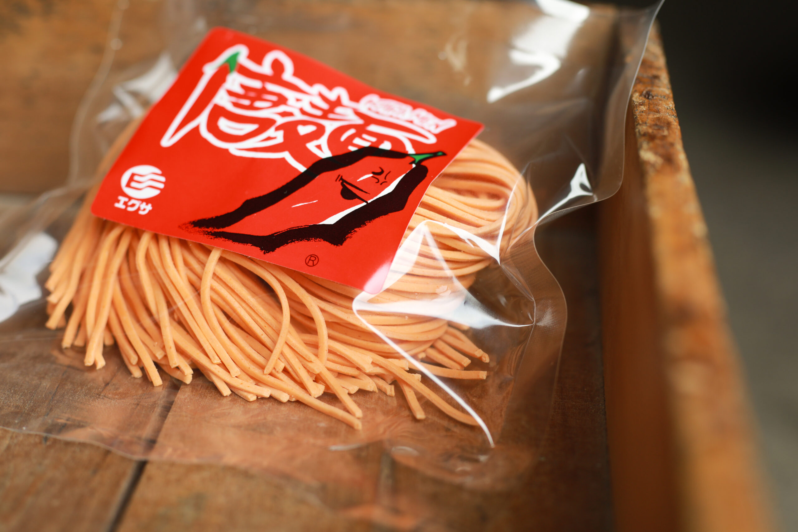 Egusa Shoten was founded over a century ago in 1918, and has been run by four generations of the Egusa family, providing fresh noodles to the people of Miyoshi. But the current owner, fourth-generation Daichi Egusa, had graduated from college and was working an entirely unrelated job in the big city when he dreamed up karamen, and his whole life took a U-turn. Working in Tokyo, Egusa had seen a rainbow of colorful noodles being used in a trendy ramen shop, and he thought that perhaps his family’s noodle factory could do one better, by making noodles with both vibrant color and distinctive flavor. In 2006 he returned to Miyoshi, took over the family business, and―as a fan of spicy foods―decided to start by kneading chili peppers into the noodles. The product quickly evolved from spicy ramen noodles into the kind of noodles that are used to make Hiroshima’s popular dish okonomiyaki, and Egusa worked with neighboring okonomiyaki shop Horaiya to perfect the recipe, finally ending up with beautiful red noodles that have a great chewy texture and a kick of chili pepper spice.