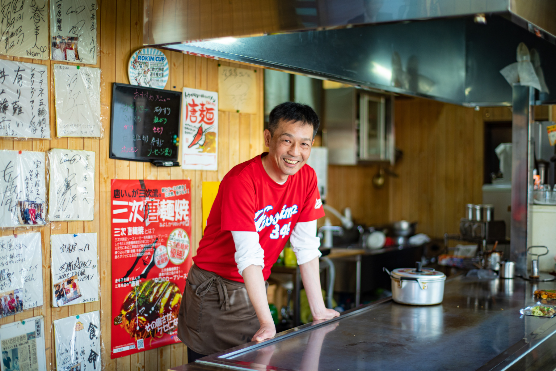 Between Okamura’s skills on the griddle, and the extra touch of spice that karamen-yaki brings to the menu, Horaiya has become a local success with the power to draw Hiroshima’s okonomiyaki-loving celebrities and athletes from all over the prefecture. But this comfortable little restaurant is the perfect place to sit down at the counter for a cold drink, a plate of the best karamen-yaki in town, hot off the griddle, and a good chat all about the history of Miyoshi’s newest culinary specialty.