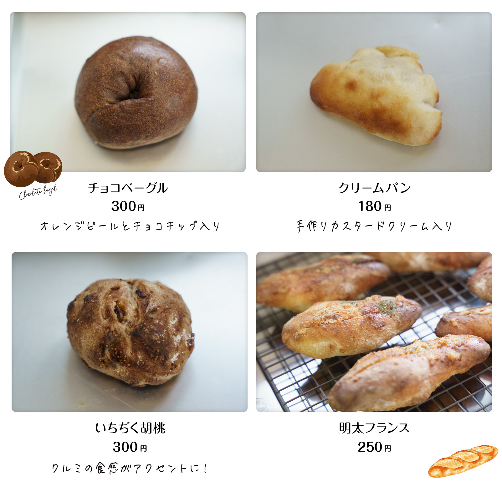 常時、13種類のパンが並びます。レギュラーの他、季節変わりのパンも2、3種用意していますので、要チェック!