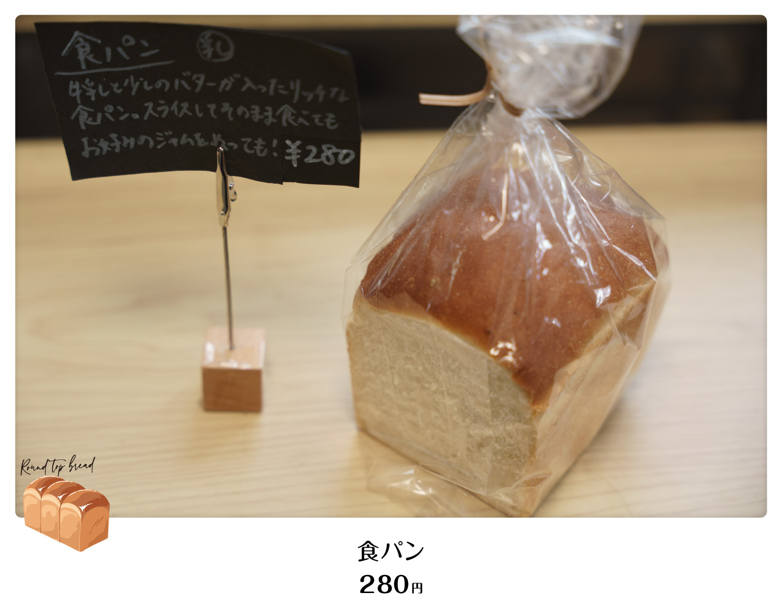 パンと店名が描かれた、こんがりパン色の看板は、店主の友達で、「工房アジュア」の小井さん作。