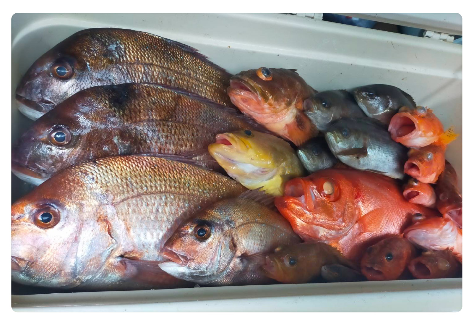 タイミングがよければ、店主の百合田雅文さんが出雲沖で釣り上げたばかりの魚を調理してもらうことができます。クーラーボックスに入れて並べられた魚は鮮度抜群!