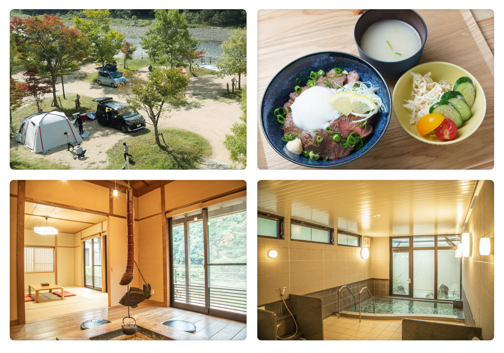 敷地内には水道・トイレ・かまどを備えたオートキャンプ場や、囲炉裏付きのコテージを完備。日帰りバーベキューから宿泊まで幅広く利用できます。冬季には、降雪前の澄んだ空気の中で焚き火や星空を楽しむ冬キャンプも密かな人気。囲炉裏では鍋料理など冬ならではの食事も堪能できます。コテージ宿泊者は道路向かいの入浴施設『くまみ湯』を無料で利用でき、広々とした湯船でゆったりと温まれます。
