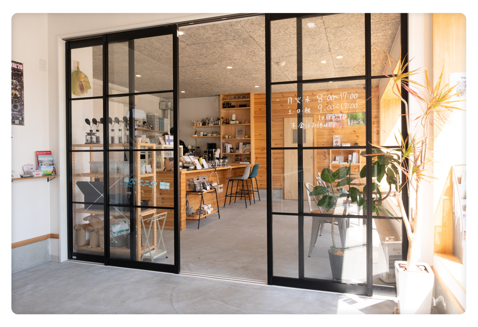 店内はナチュラルな雰囲気で、大きな窓から光が差し込む明るい空間。伊藤さんのコーヒーを淹れる丁寧な所作が見えるカウンター席もよし、三良坂の往来が見える窓際席もよし。テイクアウトも可能です。