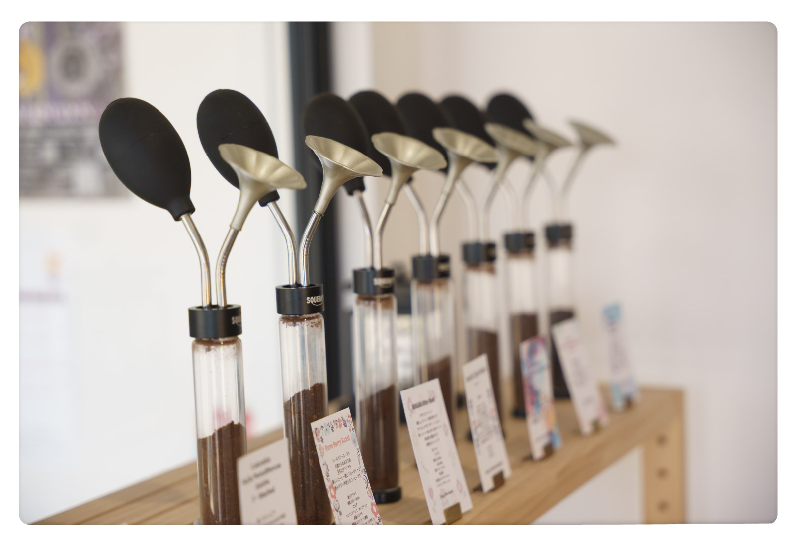 入口の棚にずらりと並んでいるのは、コーヒー粉を閉じ込めた細い筒。
