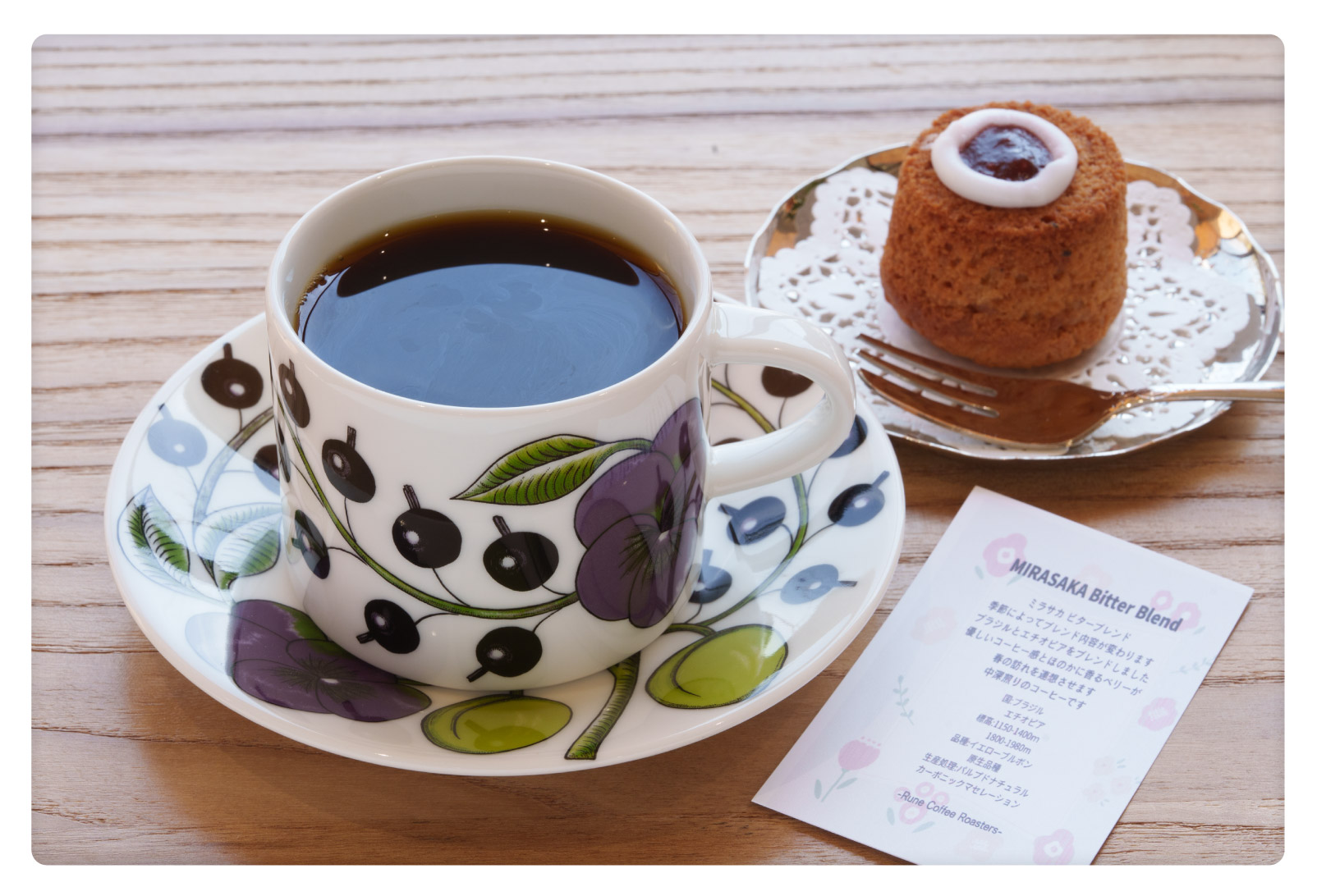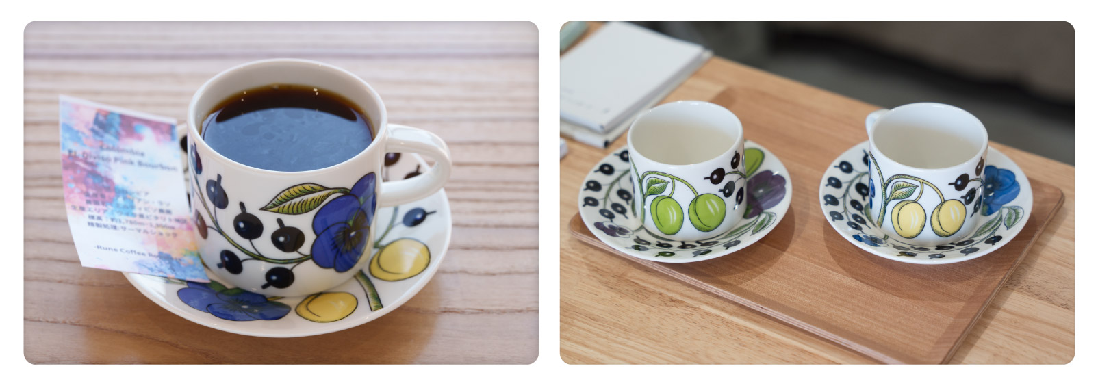北欧を代表する陶磁器ブランド「アラビア(Arabia)」のカップに注がれる、極上の一杯。カップに添えられているカードには、豆の産地や農園名、生産エリア、標高などが書かれています。ゆっくり味わいながら、豆の産地に思いを馳せてみてはいかがでしょう。