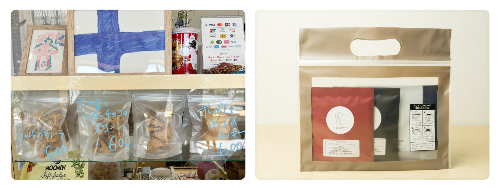 「ソルトグラノーラ」「オーツ麦とビターチョコのスコーン」「オレガノとチーズのクッキー」など、テイクアウトのお菓子もスタンバイ。ドリップコーヒー&お菓子のセットもあり、手土産に最適です。
