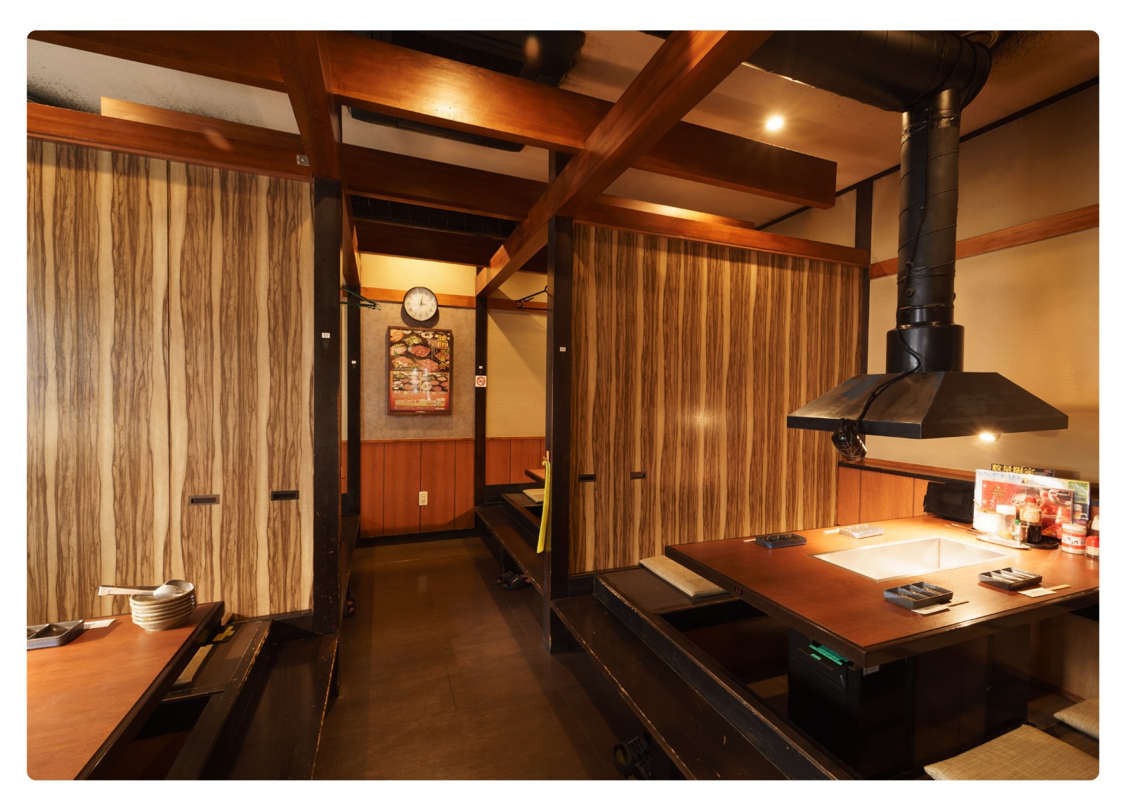 カーテンで仕切られた掘りごたつ式のテーブル席。