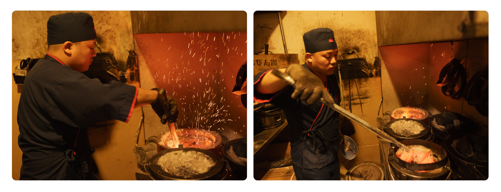炭は、営業時間内は常に火がついていて、いつでも交換できるようスタンバイしています。