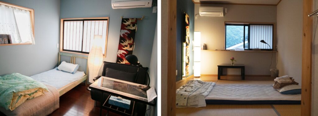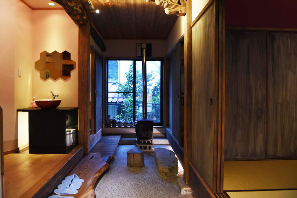 兩層樓的青貓,是獨立旅宿空間,一樓主要有廚房、餐廳、浴室洗手間等公共空間,以及一間可以住2~4人的和室「湖」;二樓則以房間為主,有一間西式單人房「月之東 太陽之西」、兩間可容納1~2人的和室「十年」和「百年」,及一間可住2~4人的大和室「千年」。房內大多都有一扇能見到山景的窗、一盞氛圍極佳的紙立燈,以及一條精緻如長掛畫的布——那是和服的腰帶(帯),多半刺繡著美麗的花紋,活用空間裝飾中,讓人們能用另一種方式好好欣賞這織品的古典美。